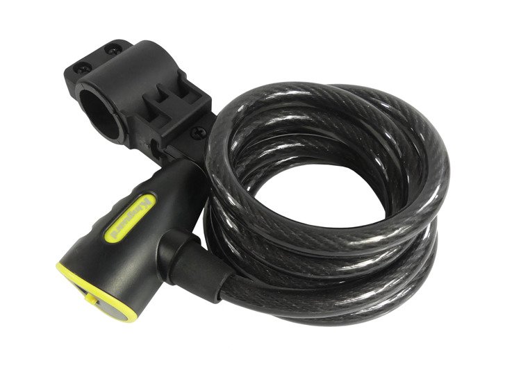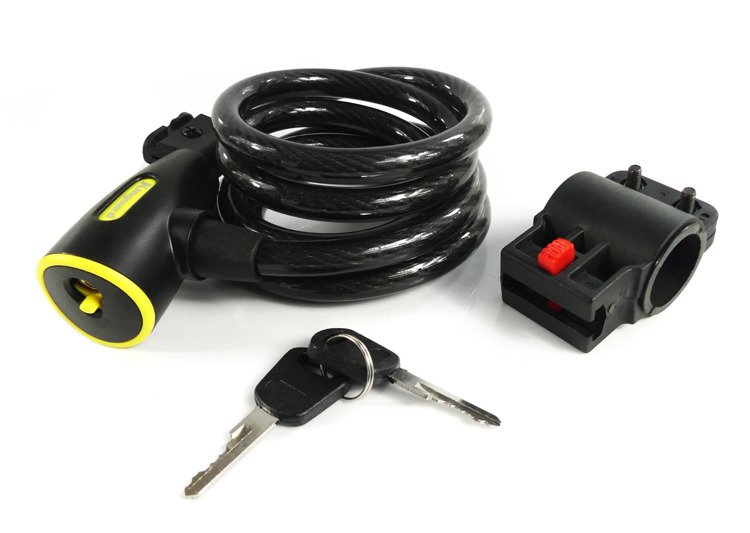 Blokada, zabezpieczenie typu spirala. Wykonana z metalowej linki w gumowej otulinie. Posiada wygodne mocowanie do ramy, kierownicy. Blokada pierścieniami.