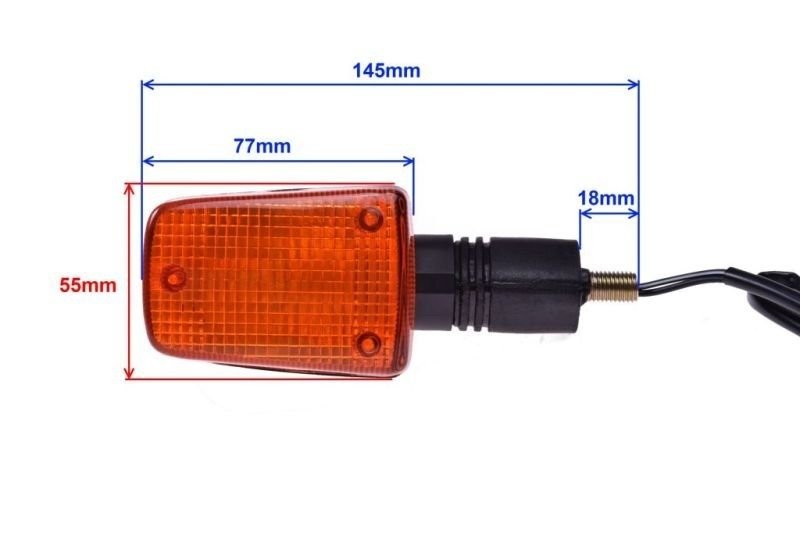 Kierunkowskaz żarówkowy przeznaczony do motocykli marki SUZUKI np. GSX-R 600 - 1100, RGV, DR, GS, może też pasować do innych. W celu dopasowania kierunkowskazu należy się sugerować poniższymi parametrami oraz wymiarami. Kierunek bardzo dobrej jakości co jest podstawą dłuższego czasu eksploatacji.