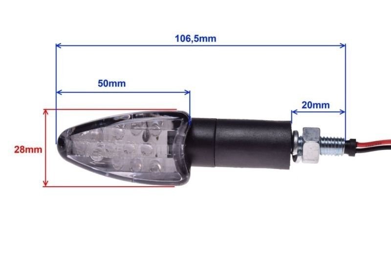 Kierunkowskazy ledowe (prawy i lewy) przeznaczone do motocykli, motorowerów, skuterów i quadów. W celu dopasowania kierunkowskazów należy się sugerować poniższymi parametrami oraz wymiarami. Kierunki bardzo dobrej jakości co jest podstawą dłuższego czasu eksploatacji.