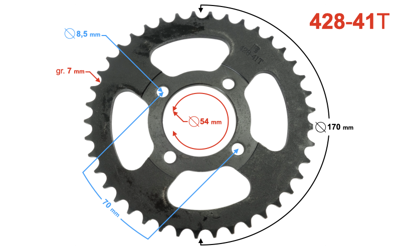 Zębatka tył 41 z 428 do Romet Via City i Ranger Classic. Prawdopodobnie też do zipp, keeway, kingway, benzer, barton, motomar, moto-magnus, baccari, ventus, motobi, cpi, sym, generic, ferro, romet, baotian, rm motors, inca, zumico, bassa, router i inne modele. Bardzo dobra jakość wykonania gwarantuje dłuższy czas eksploatacji.