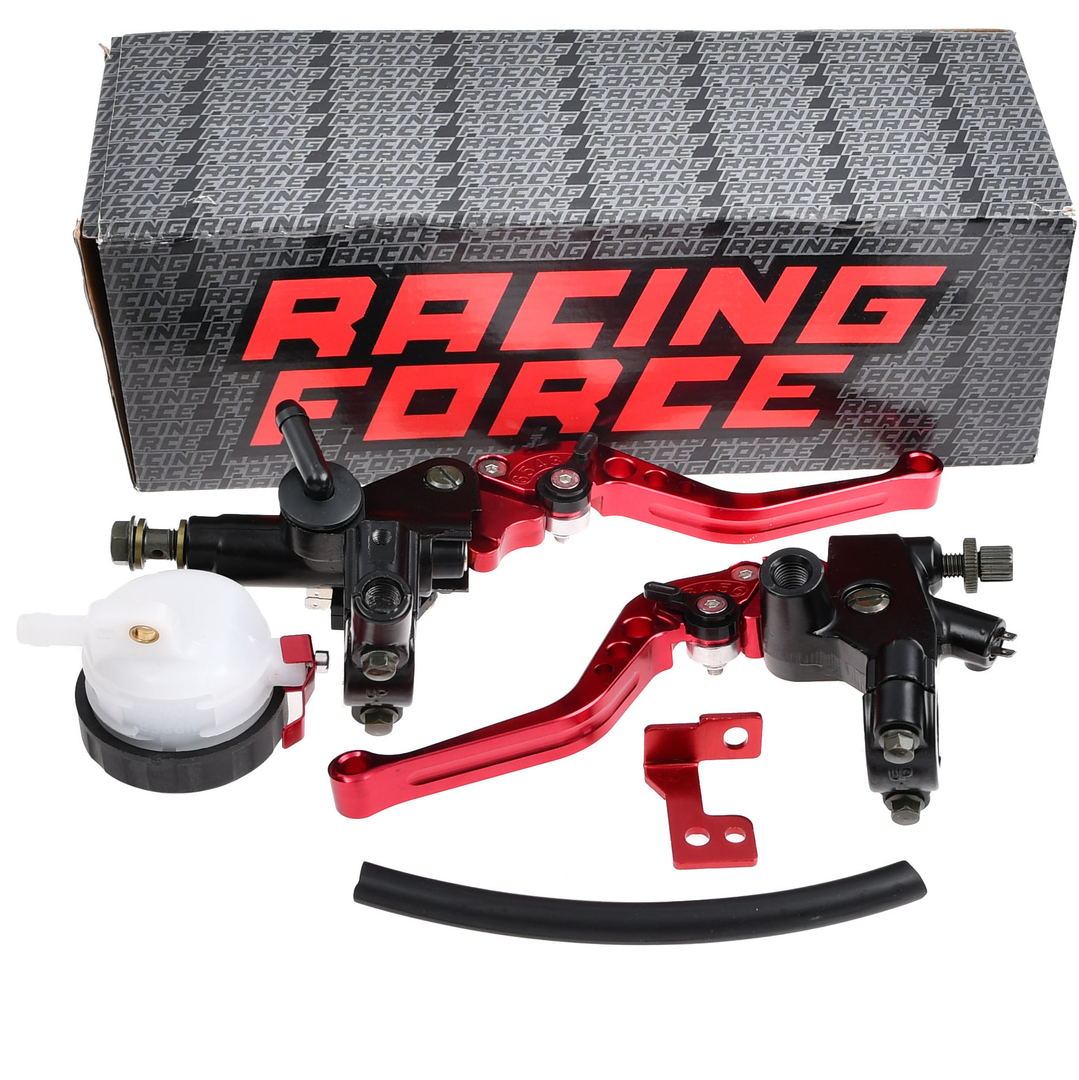 Dźwignie klamki hamulca i sprzęgła wraz z pompą hamulcową marki Racing Force w kolorze czerwonym. Zestaw pasuje do każdego motocykla z hamulcem tarczowym oraz sprzęgłem załączanym linką. Produkt wykonany z najwyższą dbałością o detale jak i wysoką jakością obróbki uzyskaną za sprawą wykonania na nowoczesnych maszynach CNC.