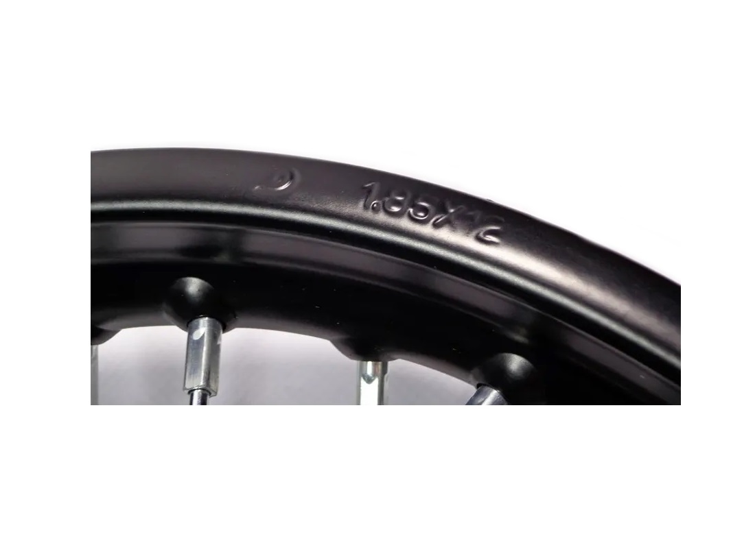 Felga tył 1.85x12 cali stalowa ze wzmocnioną piastą przeznaczona do pitbike MRF. Produkt bardzo dobrej jakości.
