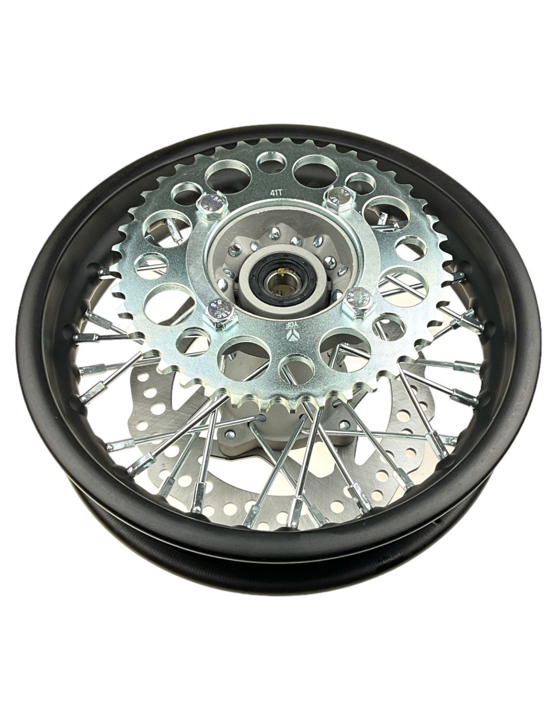 Oryginalna tylna felga w rozmiarze 1.85x10 cali w komplecie z tarczą hamulcową oraz zębatką przeznaczona do pitbike YCF. Produkt bardzo dobrej jakości.