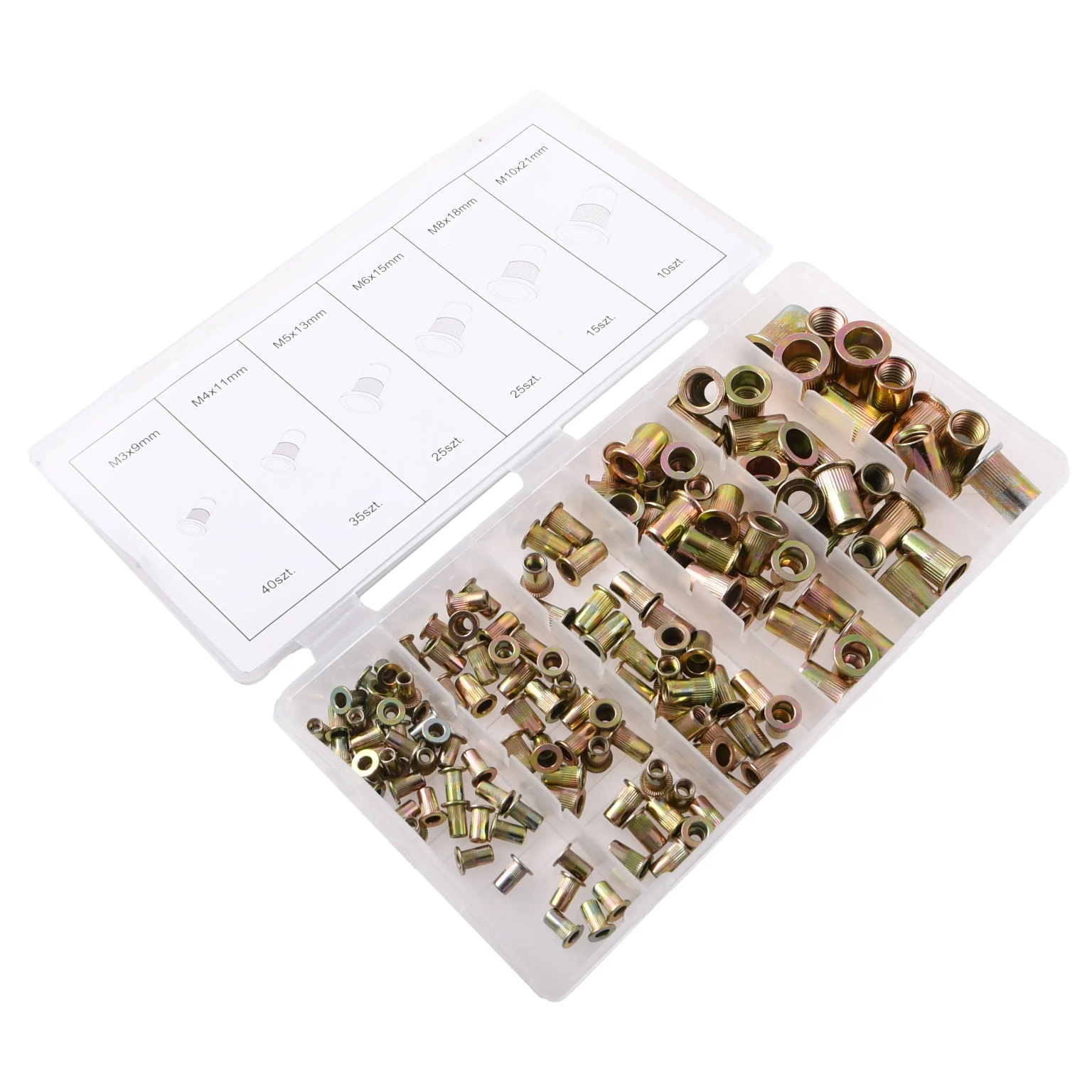 Zestaw nitonakrętek stalowych. Elementy bardzo przydatne przy wykonywaniu czynności serwisowych oraz remontów. Produkt bardzo dobrej jakości.