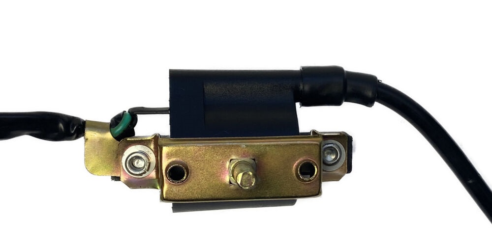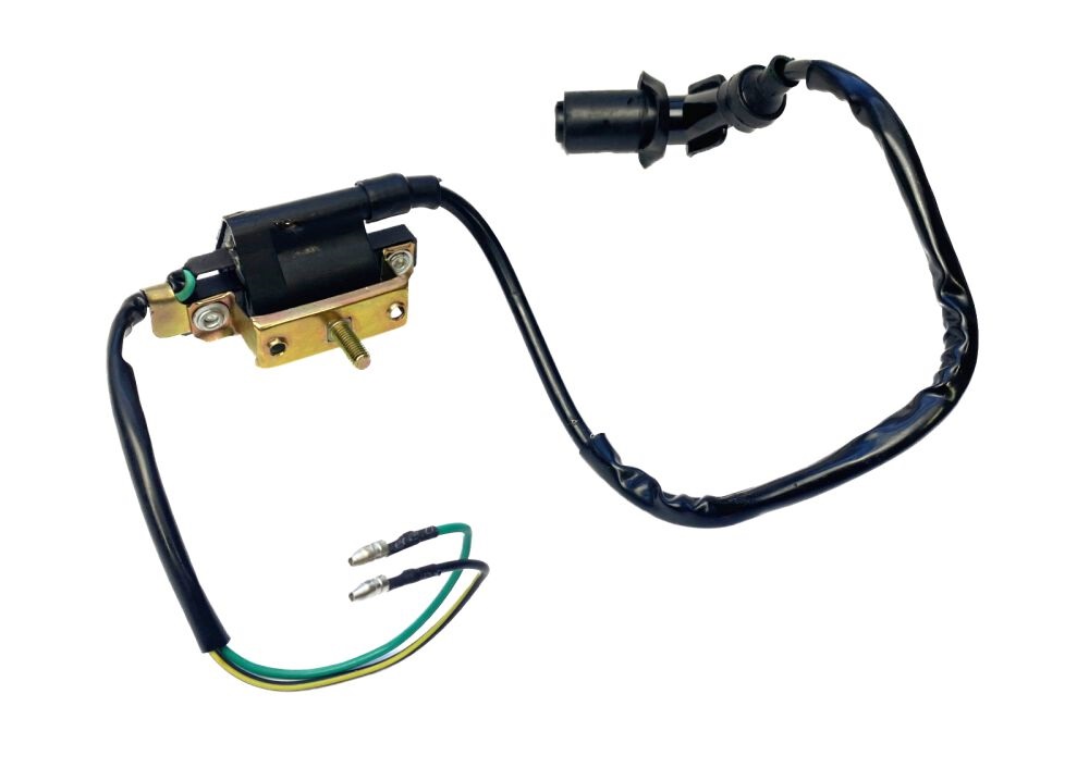 Cewka zapłonowa wraz z gumową fajką świecy zapłonowej do quadów ATV. Przewód posiada sylikonową izolację, która chroni go cewkę przed przegrzaniem i zapewnia stabilną pracę. Gumowe uszczelnienia cewki i jak i fajki zapobiegają przedostawaniu się wody do ważnych elementów. Cewka posiada 2 piny.
