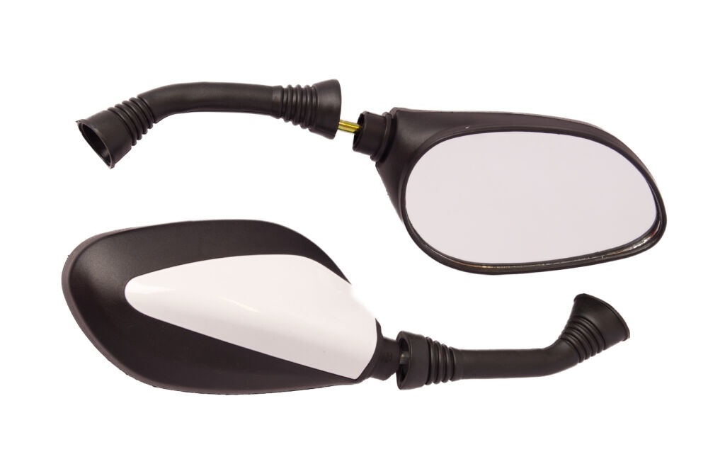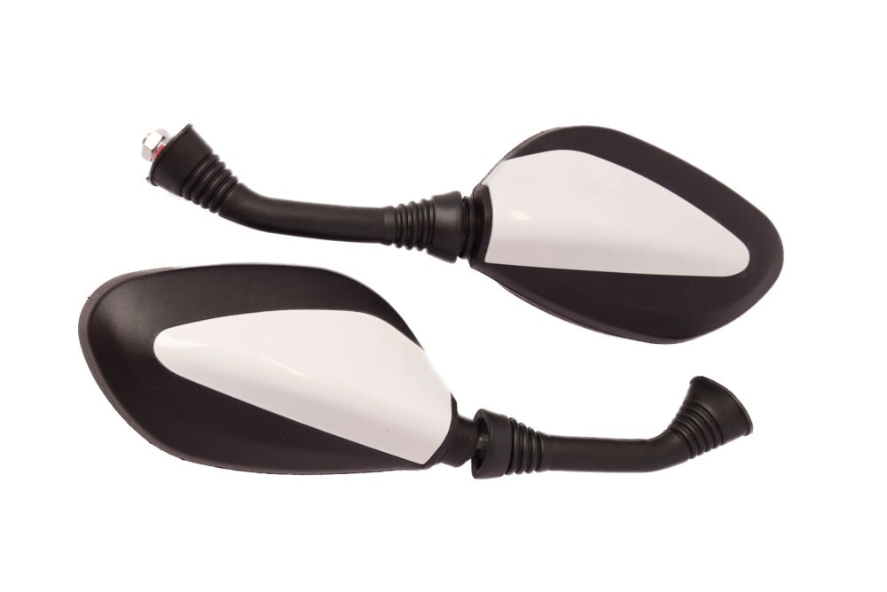 Lusterka motocyklowe czarno - białe lakierowane do uniwersalnego zastosowania. Produkt dobrej jakości.