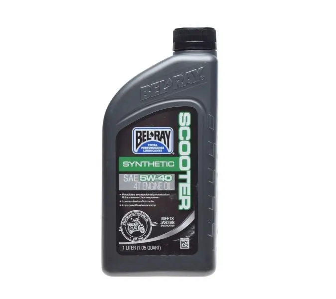 Olej silnikowy Bel-Ray Scooter Synthetic SAE 5W-40 4T to wysokiej jakości środek smarny opracowany specjalnie z myślą o specyficznych potrzebach czterosuwowych silników skuterów o małej pojemności skokowej oraz układów napędowych. Wysokiej jakości bazy olejowe i zaawansowane dodatki uszlachetniające zastosowane w olejach Scooter 4T zapewniają doskonałą ochronę przed zużyciem, doskonałą kontrolę osadów i czystość oraz lepszą smarowność. Rezultatem jest większa niezawodność i oszczędność paliwa w czterosuwowych silnikach o małej pojemności skokowej i suchych sprzęgłach.