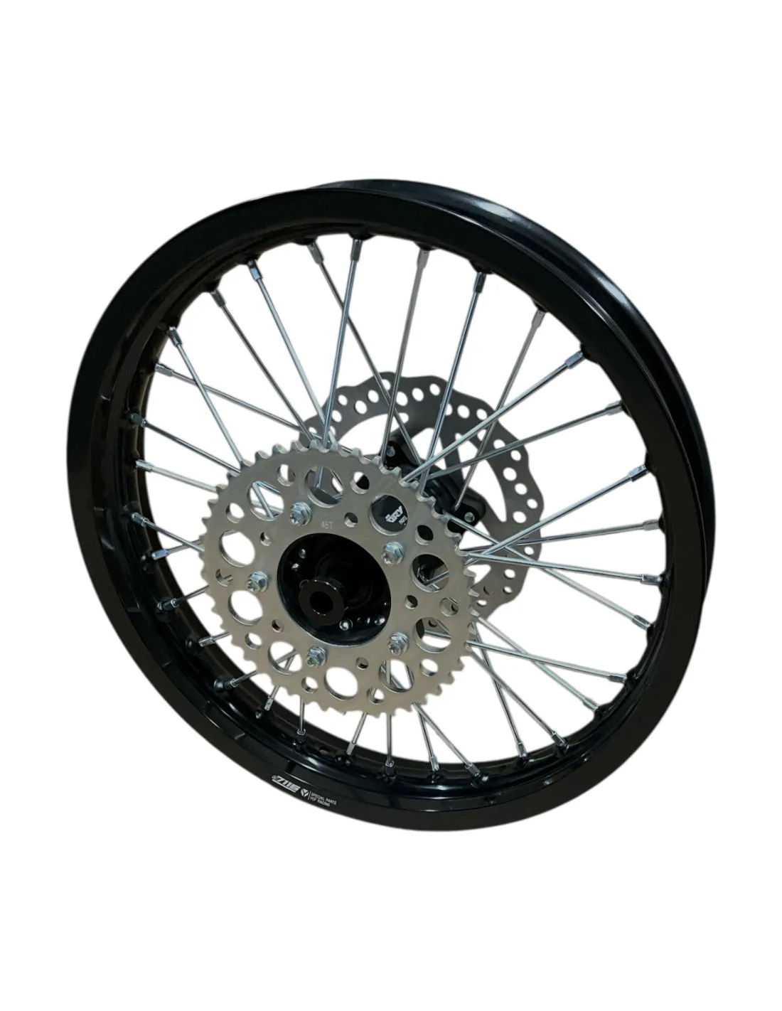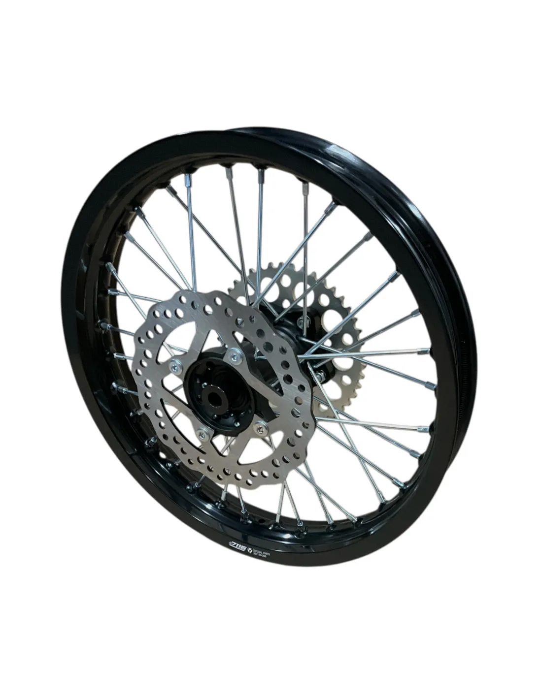 Oryginalna tylna felga aluminiowa w rozmiarze 2.15x16 cali w komplecie z tarczą hamulcową oraz zębatką przeznaczona do pitbike YCF. Produkt bardzo dobrej jakości.